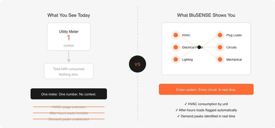 BluSENSE doesn't just tell you how much energy your building is using. It tells you what is using it, when, and whether that consumption makes sense.