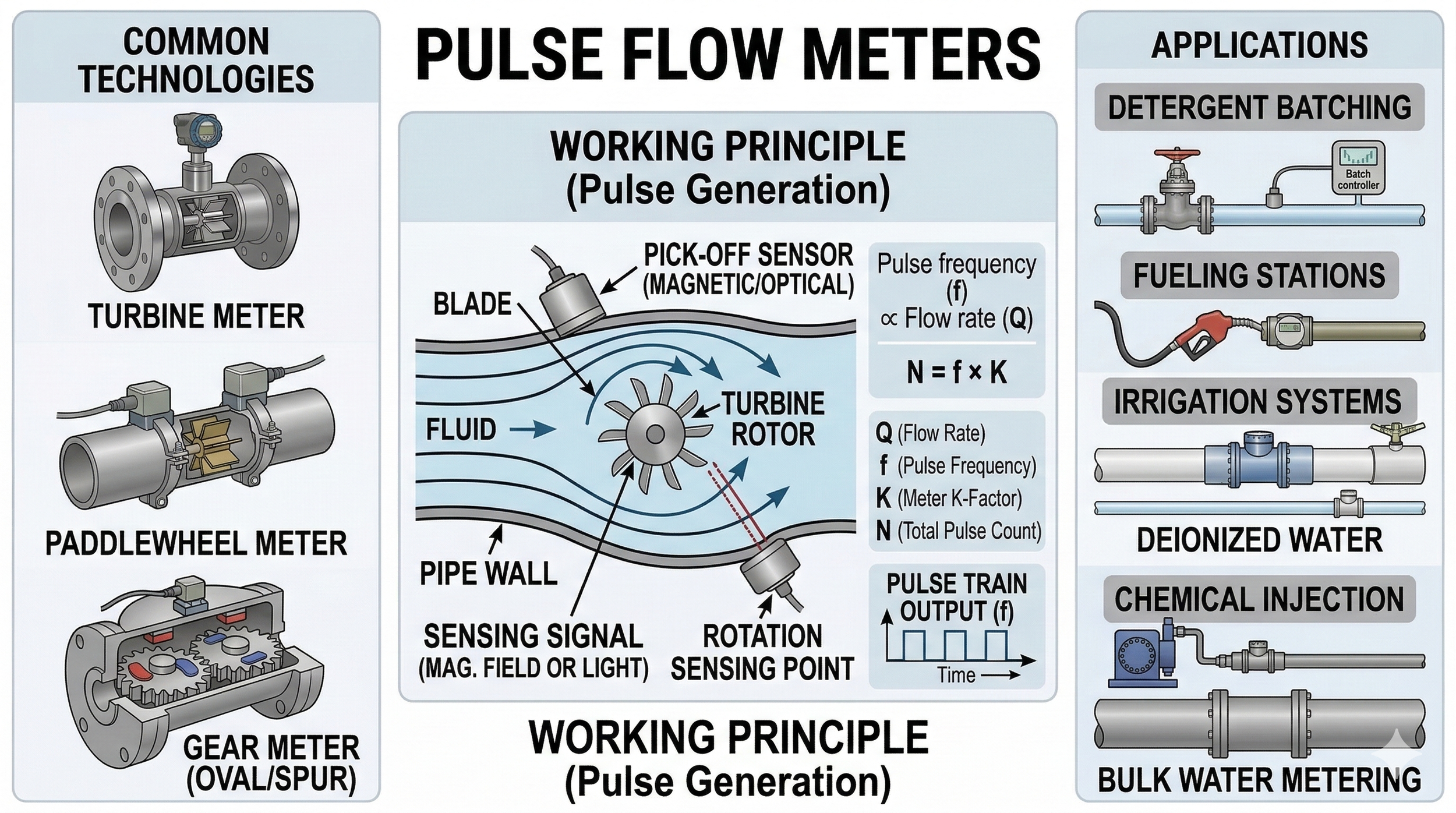 Pulse flow meters offer considerable accuracy at a low price point, making them one of the most cost-effective long-term monitoring solutions available. Flow is calculated using a K-factor — a formula that correlates pulse count over time with flow rate, based on the pipe's inner diameter and the geometry of the turbine or flow wheel inside the sensor.