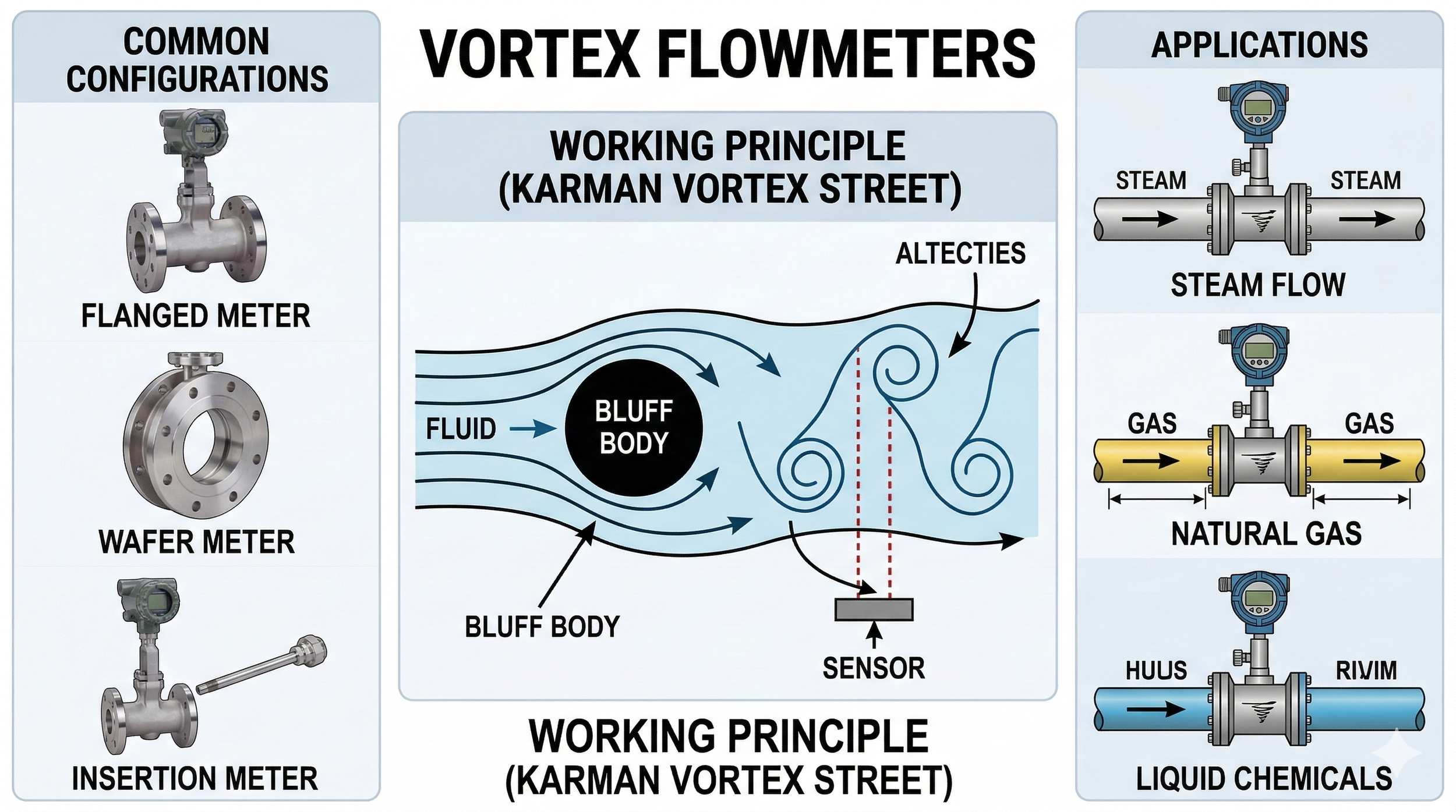 One important limitation: vortex flow meters cannot reliably read flows below 1 liter per minute (approximately ¼ gallon per minute), which makes them unsuitable for leak detection. Their key advantage over other in-line options is that they simultaneously measure pressure and temperature alongside flow — three measurements in one device, with no additional sensors required. Output is typically 4-20mA, voltage signal, Modbus, or serial communication.