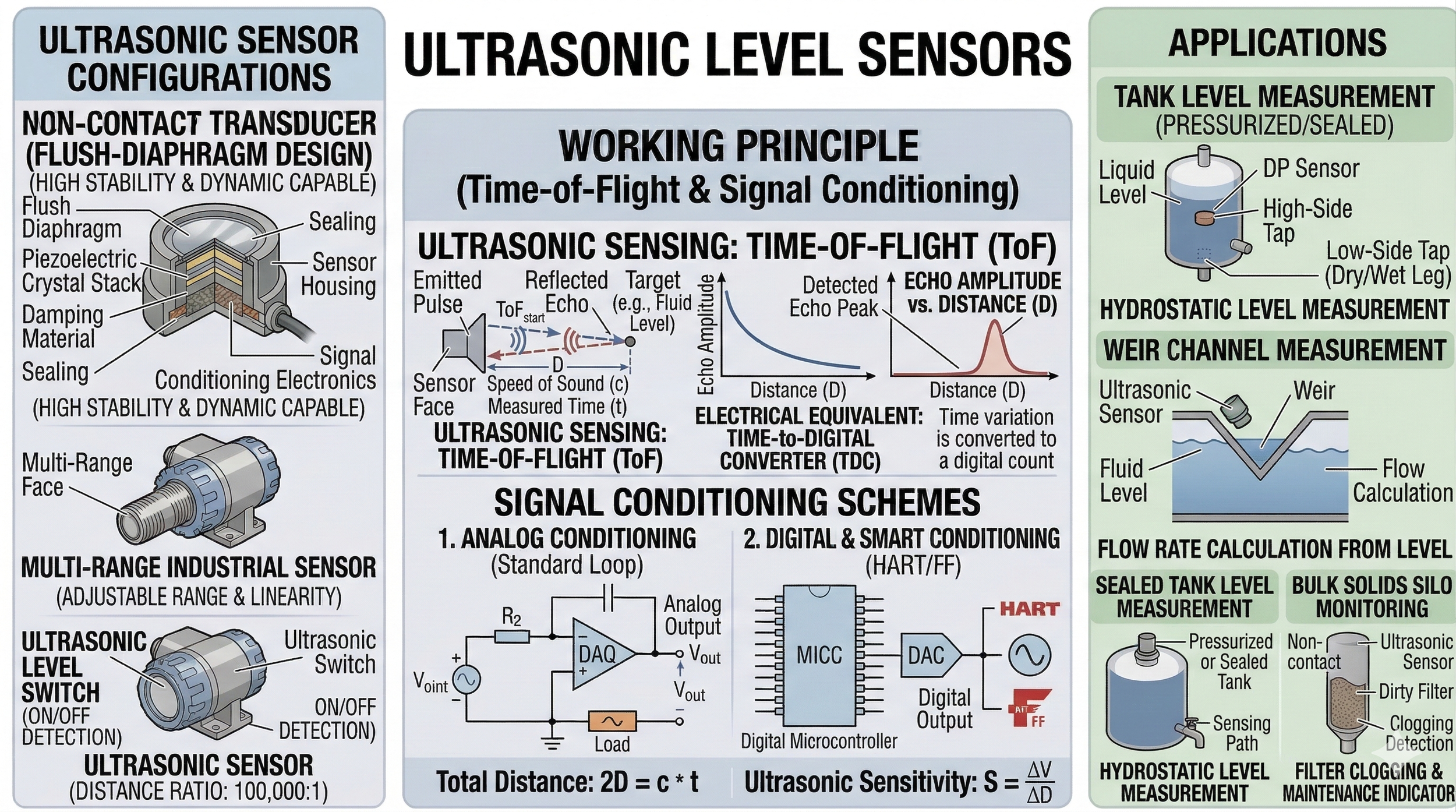 Ultrasonic level sensors are our go-to recommendation for most level monitoring applications — and the reasons are straightforward. The sensor mounts above the liquid surface and periodically emits an ultrasonic pulse downward. When the pulse hits the liquid surface it reflects back, and a Time of Flight (ToF) circuit measures how long the return trip takes. Subtracting that distance from the known depth of the tank gives you a continuous, accurate level reading.